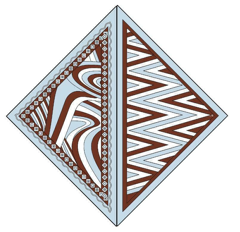 O lenço possui toque de seda, caimento leve e é duplo e possui estampas que se complementam em ambos os lados. O formato desse lenço é triângular.