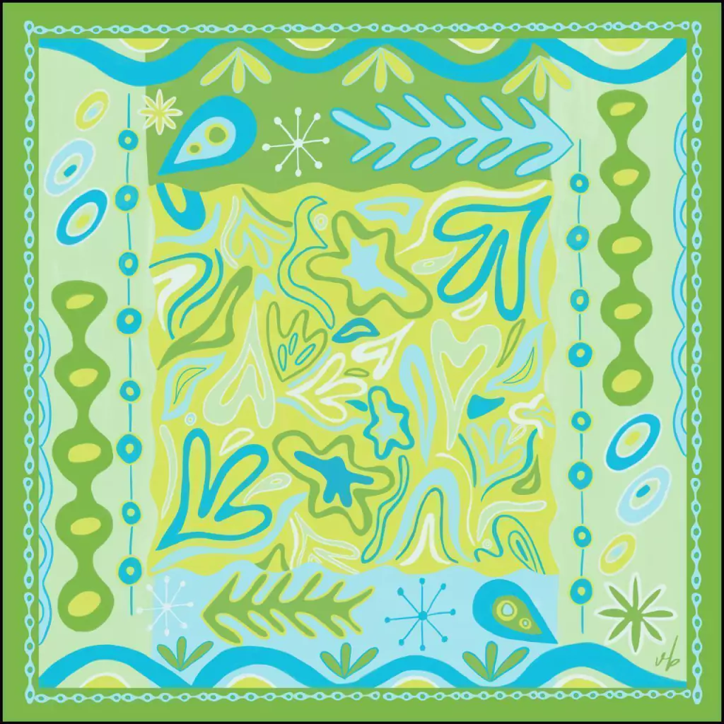 Lenço. A estampa Ibiza reflete a beleza paradisíaca da ilha com seus diversos tons de azul e verde que capturam a transparência do mar Mediterrâneo e sua conexão com a natureza exuberante. Os movimentos orgânicos representados na estampa remetem à energia vibrante da vida noturna de Ibiza, onde a música, as luzes e a dança criam uma harmonia fluida, como as ondas que banham suas praias.